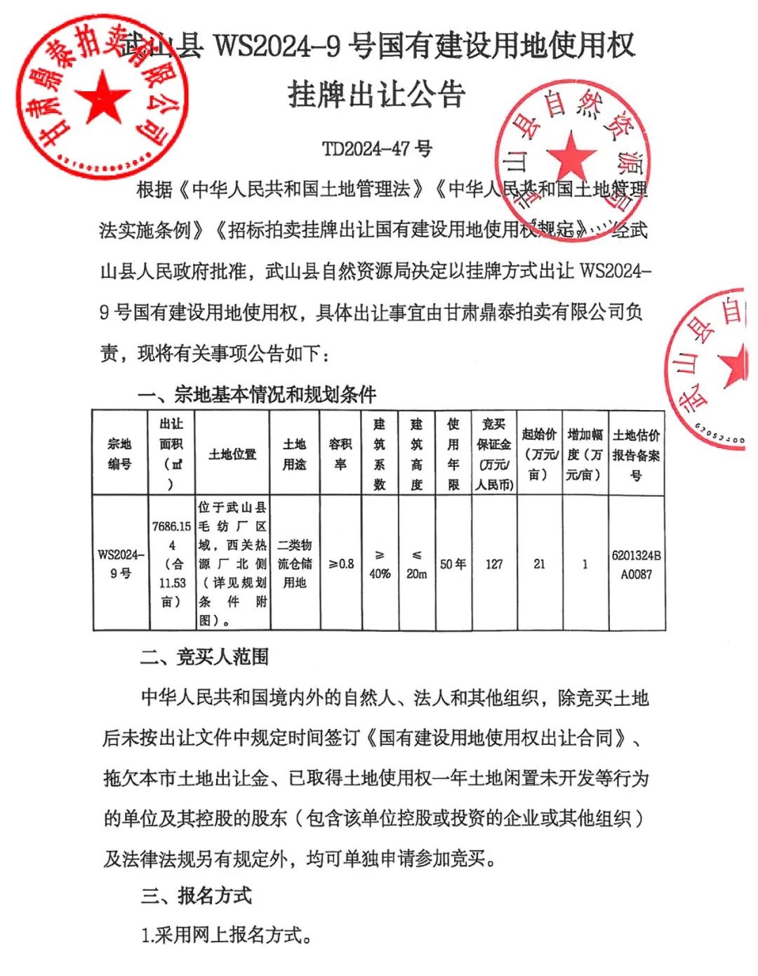2024年11月7日,天水市公共资源交易中心发布了“武山县ws2024-4号、ws2024-5号、ws2024-6号、ws2024-7号、ws2024-8号和ws2024-9号6宗国有建设用地使用权挂牌出让公告”,具体内容如下:ws2024-4号宗地,土地位置位于武山县洛门镇第三小学南侧,中医院北侧。出让土地面积12412.139㎡(合18.62亩),土地用途为二类城镇住宅用地,容积率≤3.5,建筑密度≤28%,绿地率≥30%。出让年限70年。ws2024-5号宗地,出让土地面积10314.255㎡(合15.47亩),土地位置位于武山县毛纺厂东区,渭川养老院南侧,土地用途为二类城镇住宅用地,容积率≤3.5,建筑密度≤28%,绿地率≥30%,建筑高度≤80m。使用年限70年。ws2024-6号宗地,出让土地面积12972㎡(合19.458亩),土地位置位于武山县太皇山区域,土地用途为工业用地(⻛力发电),容积率≥0.8,建筑系数≥ 40%,使用年限50年。ws2024-7号宗地,出让面积4441.026㎡(合6.66亩),拟出让地块位于g310国道武山县洛门镇营儿村北侧(详见规划条件表附图)。土地用途为公用设施营业网点用地。容积率≤2.5,建筑密度≤45%,绿地率≥20%,使用年限40年。ws2024-8号宗地,出让面积2695.877㎡(合4.04亩),拟出让地块位于武山县鸳鸯镇鸳鸯新农村东侧(详见规划条件表附图)。土地用途为零售商业用地。容积率≤2.5,建筑密度≤45%,绿地率≥20%,使用年限40年。ws2024-9号宗地,出让面积7686.154㎡(合11.53亩);拟出让地块位于武山县毛纺厂区域,西关热源厂北侧(详见规划条件附图);土地用途为二类物流仓储用地;容积率:≥0.8;建筑系数:≥40%;建筑高度:≤20m。使用年限50年。